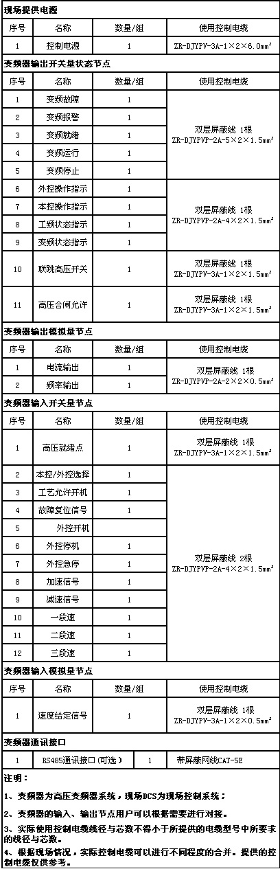 功率電纜的選型必須嚴(yán)格按照以下要求選型:電纜的載流量;電纜制造廠家的規(guī)范;安裝敷設(shè)的方式;電纜長度引起的壓降;符合電力行業(yè)規(guī)范;符合EMC規(guī)范。另變頻器與用戶設(shè)備(高壓電源柜、電機(jī))之間的高壓電纜建議采用有屏蔽作用的鎧裝電纜(防止鼠害;滿足EMC要求)。