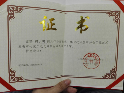 在同期召開(kāi)的化工電氣專家組第二屆全體代表大會(huì)上,新風(fēng)光公司技術(shù)總監(jiān)郭少明,被中國(guó)機(jī)電一體化技術(shù)應(yīng)用協(xié)會(huì)聘為工程技術(shù)發(fā)展中心化工電氣專家組成員單位專家。