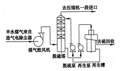 造氣 ->半水煤氣脫硫 ->壓縮機1段 ->變換 -> 變換氣脫硫 -> 壓縮機2段 ->脫碳 -> 精脫硫 ->甲烷化 ->壓縮機3,4,5段 ->氨合成 ->產(chǎn)品NH3