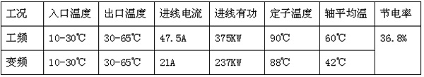 根據(jù)生產(chǎn)情況,風機運行30HZ左右就能滿足了生產(chǎn)工藝要求;運行轉速在額定轉速的60%左右。由于電機為水冷卻,在低轉速下發(fā)熱量并沒有提高,完全滿足了工況運行。