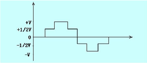 其中主電路每相接有四只IGBT,串聯(lián)承擔(dān)全部的電壓,三相交流電壓經(jīng)全波整流后變成直流電壓,由單片機(jī)控制四只IGBT的導(dǎo)通與截止,形成SPWM的交變輸出。為抑制IGBT交變過程中的電壓突變,采用了中點(diǎn)箝位電路,有兩只快恢復(fù)二極管串聯(lián)組成箝位二極管,其中心點(diǎn)與濾波電容的中心點(diǎn)相連接,組成本電路的中心點(diǎn)(三電平的中心電平)。其輸出波形如圖2所示。