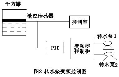 如圖2所示,將油水界面的液位傳感器所變換的4-20mA電流信號分別傳至控制室及變頻控制的PID調節(jié)器,由PID進行比例、積分、微分處理后送給變頻器,由該信號調節(jié)變頻器的頻率,即可調節(jié)水泵的轉速,實現(xiàn)頻率對液位的跟蹤。
