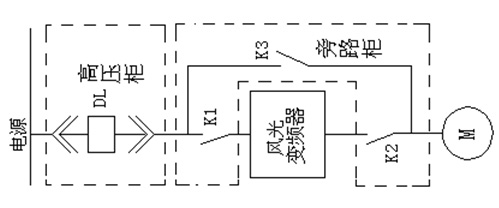 手動旁路中,共有3個高壓隔離開關(guān)K1、K2、K3,當(dāng)K1、K2閉合,K3斷開時,10kV電源經(jīng)隔離刀閘K1到高壓變頻裝置,變頻裝置輸出經(jīng)K2送至電動機,電動機變頻運行;一旦變頻裝置出現(xiàn)故障,可斷開隔離刀閘K1、K2,合上K3,在工頻電源下啟動電機運行,此時變頻器從高壓中隔離出來,便于檢修、維護和調(diào)試。隔離刀閘K1、K2、K3之間具有閉鎖和防止誤操作功能。