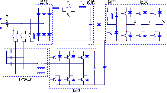 修井機(jī)要求變頻器四象限運(yùn)行,對(duì)于產(chǎn)生的再生能量要求變頻器配有回饋單元進(jìn)行處理,變頻器主回路結(jié)構(gòu)如圖1所示。