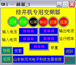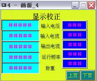 (1)觸摸屏共四個(gè)畫面:第一面如圖3所示,上面具有正轉(zhuǎn)指示、反轉(zhuǎn)指示、松閘指示、制動(dòng)報(bào)警指示、故障指示、超重指示。電壓顯示,輸入電流顯示,輸出電流顯示,頻率顯示,重量顯示。按鈕/面板是用按鈕操作還是觸摸屏操作的選擇鍵。報(bào)警/靜音用來(lái)故障聲音報(bào)警,開環(huán)/閉環(huán)用來(lái)超重限制開機(jī),按操作鍵進(jìn)入第二畫面,如圖4所示。根據(jù)文字提示可進(jìn)行相應(yīng)操作。第三畫面是時(shí)間和日期,如圖5所示。按下頁(yè)鍵進(jìn)入第四畫面,如圖6所示,第四畫面是顯示校正。