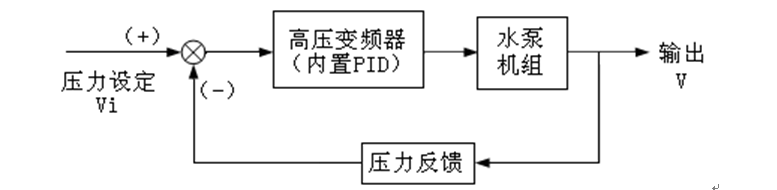 針對現(xiàn)場存在的問題,系統(tǒng)優(yōu)化改造主要需解決兩方面的問題:第一,在滿足系統(tǒng)配注水量的基礎(chǔ)上盡可能減少排量損失;第二,在滿足注水壓力的前提下盡可能減少泵管壓差,即減少壓力損失。因此采用的是注水系統(tǒng)恒壓控制方式,其工作原理如圖1所示,測量元件為壓力傳感器,將它設(shè)在柱塞水泵機(jī)組出水管網(wǎng)上,Vi為恒定注水壓力設(shè)定值,注水壓力V作為輸出量,構(gòu)成閉環(huán)控制系統(tǒng)。變頻器內(nèi)部的PLC采集注水壓力值V與用戶給定值Vi進(jìn)行比較和運(yùn)算,通過PID進(jìn)行調(diào)整,將結(jié)果轉(zhuǎn)換為頻率調(diào)節(jié)信號送至變頻器,直至達(dá)到注水壓力的給定值Vi。不管系統(tǒng)注水流量如何變化,注水壓力值V始終維持在給定壓力值Vi附近。