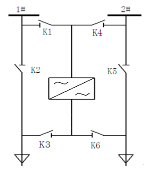 該注水站結(jié)合該自身的實(shí)際情況,為滿足泵站的安全運(yùn)行需求,要求柱塞水泵電機(jī)一用一備設(shè)置,選擇新風(fēng)光高壓變頻調(diào)速系統(tǒng)采用一拖二手動運(yùn)行方式(變頻器分別接1100kW水泵2臺)。其主回路圖如圖2所示,其中K1刀閘與K4刀閘互鎖,保證兩路高壓電源不會同時作用于變頻回路;K2刀閘與K3刀閘互鎖,保證工頻電源與變頻電源不會同時作用于電機(jī)M1;K5刀閘與K6刀閘互鎖,保證工頻電源與變頻電源不會同時作用于電機(jī)M2。