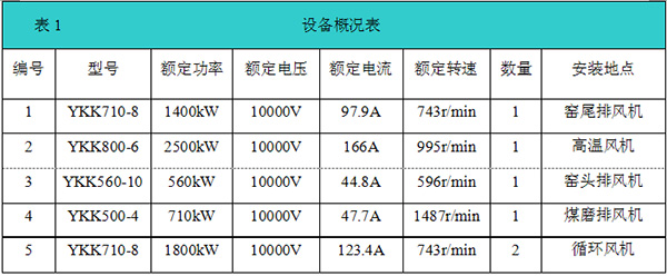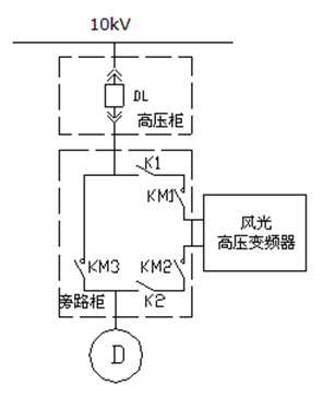 在風(fēng)機(jī)改造過(guò)程中,高溫風(fēng)機(jī)(2500kW/10kV、1套)采用“一拖一”控制加自動(dòng)旁路柜,窯頭排風(fēng)機(jī)(560kW/10kV、1套)、窯尾排風(fēng)機(jī)(1400kW/10kV、1套)、煤磨排風(fēng)機(jī)(710kW/10kV、1套和循環(huán)風(fēng)機(jī)(1800kW/10kV、2套)采用“一拖一”控制加手動(dòng)旁路柜。