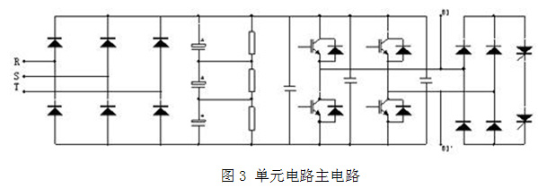 風(fēng)光高壓變頻器,采用若干個(gè)低壓逆變器功率單元串聯(lián)的方式實(shí)現(xiàn)直接高壓輸出,單元電路模塊化設(shè)計(jì),維護(hù)簡(jiǎn)單,互換性好,高壓主回路與控制器之間為光纖連接,強(qiáng)弱電隔離,安全可靠,該10kV高壓變頻器,變壓器有24組付邊繞組,分為8個(gè)功率單元∕相,三相共24個(gè)單元,采用36脈沖整流,輸入端的諧波成分低于國(guó)標(biāo)規(guī)定,高壓變頻器系統(tǒng)結(jié)構(gòu)如圖2所示,單元電路的主電路如圖3所示。