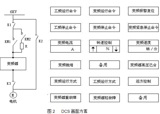 如圖2所示,利用DCS控制系統(tǒng)的預(yù)留點,設(shè)計高壓變頻改造控制、運行監(jiān)視系統(tǒng),系統(tǒng)包括工、變頻的運行、停止命令按鈕;轉(zhuǎn)速調(diào)節(jié)按鈕;變頻器復(fù)位按鈕、緊急停止按鈕;變頻器運行電流、電機轉(zhuǎn)速顯示;高壓柜以及變頻合閘顯示;變頻器故障報警顯示。