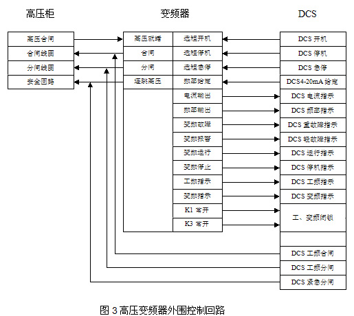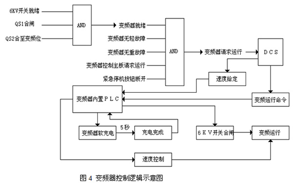 如圖4所示,當(dāng)所有開機條件都具備后,DCS發(fā)出變頻運行命令,變頻器內(nèi)置PLC發(fā)出“合閘”信號至6kV高壓柜,現(xiàn)場6kV小車開關(guān)合閘,變頻器進行軟充電,5S后充電完成,變頻器處于就緒狀態(tài),由DCS給出4-20mA信號控制變頻器頻率來改變電機轉(zhuǎn)速。