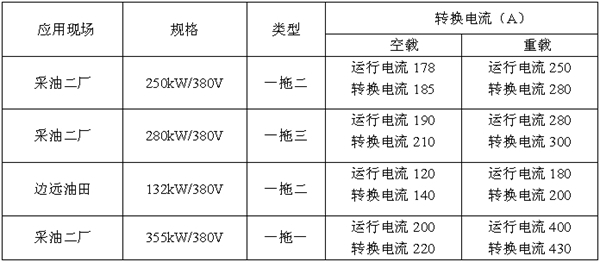 我們公司在青海油田應(yīng)用了幾套大功率一拖多的控制柜,從調(diào)試的情況看,轉(zhuǎn)換效果都比較理想。現(xiàn)將轉(zhuǎn)換試驗(yàn)的效果列出表格,如下: