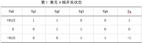 三電平電路,每一相橋臂4個(gè)開關(guān)元件有三種正常的開關(guān)模式。以A相為例:Ug1和Ug2導(dǎo)通時(shí),A相輸出+U0/2;Ug2和Ug3導(dǎo)通時(shí),A相輸出零電平;Ug3和Ug4導(dǎo)通時(shí),A相輸出-U0/2。如果用Sa、Sb、Sc分別表示各橋臂的開關(guān)狀態(tài),每一橋臂都有三種開關(guān)狀態(tài),如表1所列。