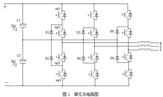 當(dāng)裝置功率大時(shí),需要這樣幾個(gè)主電路并聯(lián),并聯(lián)時(shí)需考慮均流與環(huán)流及其相位問題,同時(shí)采用二極管鉗位的三電平電路需考慮直流端電容中點(diǎn)電位不平衡問題,在軟件PWM波生成電路中尤其注重此點(diǎn)。