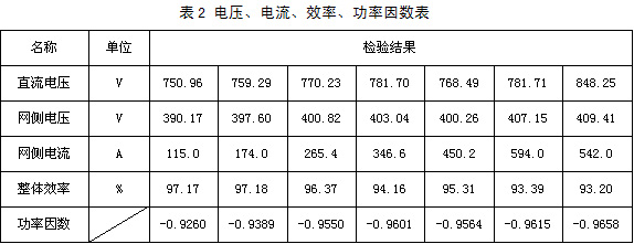 我公司做的大功率可再生能源回饋并網(wǎng)裝置經(jīng)鐵道部產(chǎn)品質(zhì)量監(jiān)督檢驗(yàn)中心檢驗(yàn)證明:具有輸出功率大、網(wǎng)側(cè)電流波形好、整體效率高等特點(diǎn)。表2是功率因數(shù)、直流側(cè)輸入電壓、網(wǎng)側(cè)交流電流及整體效率的簡表。