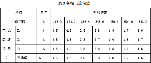 表3是接表2的網(wǎng)側(cè)各相電流的諧波含量表。