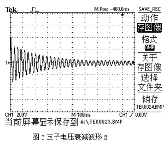三相電動機正常運行時,以同步轉速旋轉的主磁場在定子三相繞組內感應對稱的三相電動勢。若斷開電源后,主磁場消失,但曾經被主磁場磁化的轉子鐵芯依然存在剩磁,與此同時由于慣性轉子依然高速旋轉,在定子線圈產生的感應電動勢并不會在極短的時間內消失,只是有所衰減。圖2是一37KW電機兩相之間,在斷開變頻器輸出前、后的的定子繞組的電壓波形,由此可看出,斷開電源后定子線圈的感應電動勢逐漸衰減的過程。圖3是圖2的展開,仔細觀察該圖可以看出,隨著轉速的降低,轉子繞組電壓頻率也在緩慢的下降。