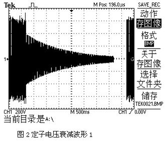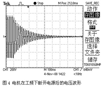 由于變頻器輸出的是PWM波,其相位不易觀察,測得在工頻狀態(tài)下的電壓波形進行進一步的分析。因為變頻器50Hz時的輸出電壓與工頻電壓作用在電機上基本時等效的,并不影響分析結果。圖4是一2.2KW電機在工頻電源下突然斷開電源后的電壓波形圖,由該圖可以看出,電壓波形沒有跳變,所以斷開瞬間感應電動勢與電源電壓是同相位的,其幅值也是基本相等的。隨著剩磁的慢慢消失,電壓幅值逐漸降低,同時伴隨著轉速的降低感應電動勢的頻率逐漸下降,其相位也逐漸與電源相位拉開。頻率越低,單位時間內拉開的相位差也就越大。