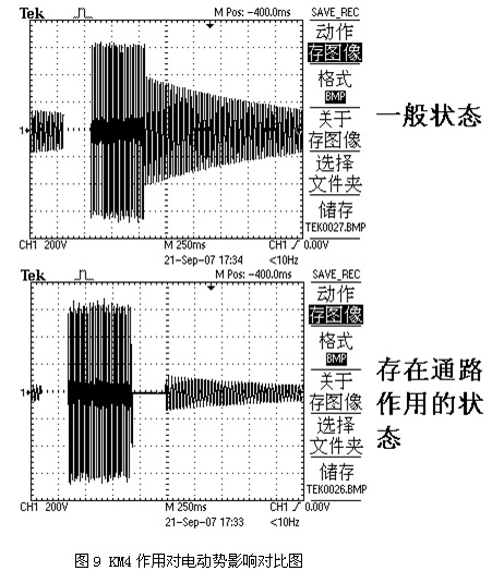 KM4作用對電動勢影響對比圖。由圖9可以看出,KM4提供通路的作用時間約為300ms,作用后該時刻與一般狀態(tài)同一時刻的感應電動勢幅值相比幅值小了很多。適當控制KM4的作用時間,讓其幅值減小到額定電壓的三分之一以下就可以了。這樣,即使切換至工頻電源時刻感應電動勢與工頻電源的相位相差180°,△U也不會超出其許可的安全范圍了。在KM4的作用過程中,會加快電機的轉速下降,但通過試驗得知,KM4的作用對電機轉速的影響比對感應電動勢幅值的影響要顯得多。