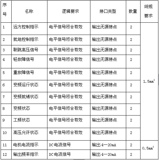 ?。?)外部高壓就緒,故障輸出,報(bào)警輸出,就地指示,遠(yuǎn)程指示,變頻指示,工頻指示,遠(yuǎn)程急停,遠(yuǎn)程開機(jī),遠(yuǎn)程停機(jī),遠(yuǎn)程頻率給定,電流輸出,頻率輸出,工藝允許,聯(lián)跳外部高壓等。
