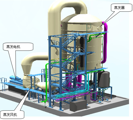 蒸發(fā)風(fēng)機(jī)的主要作用是將注入蒸發(fā)器的廢液蒸汽回收然后再送入散熱片中起到增壓升溫的作用,需要說明的是,在蒸發(fā)風(fēng)機(jī)開啟之前,需要補(bǔ)給新鮮蒸汽當(dāng)溫度達(dá)到96℃以上時(shí)就可以開啟蒸發(fā)風(fēng)機(jī),達(dá)到自循環(huán)關(guān)閉新鮮蒸汽起到節(jié)約的作用。其蒸發(fā)的冷凝液經(jīng)過冷卻后又可被回收利用,從而節(jié)約了清水資源。