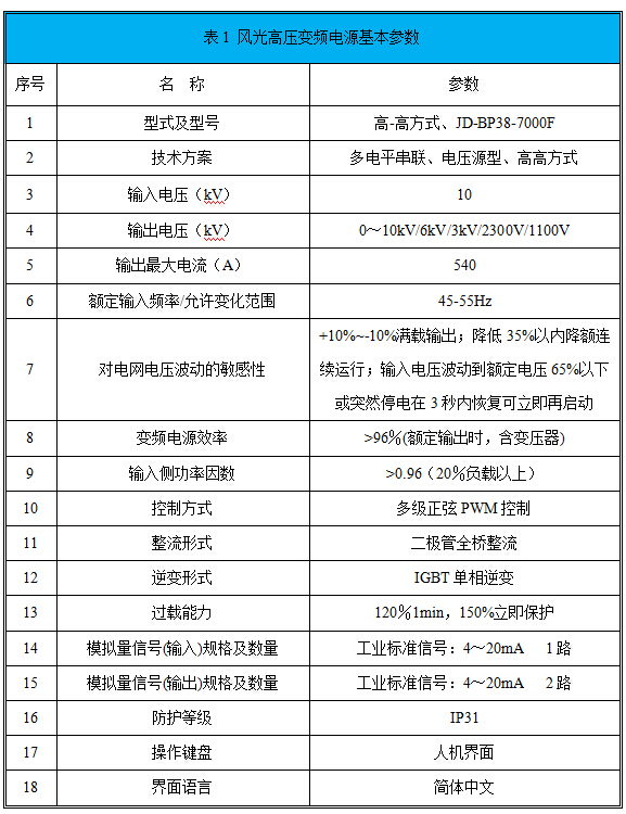 風(fēng)光高壓變頻電源系統(tǒng),以高可靠性、易操作、高性能為設(shè)計(jì)目標(biāo)。高壓變頻電源系統(tǒng)采用新IGBT功率器件,全數(shù)字化微機(jī)控制,有關(guān)電源基本參數(shù)如表1所示。