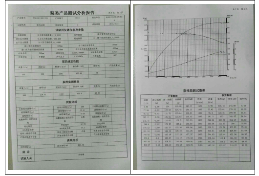測(cè)試中心對(duì)水泵的流量、揚(yáng)程、轉(zhuǎn)速、軸功率及效率等性能參數(shù)進(jìn)行實(shí)際測(cè)試。在水泵不同流量的條件下,分別對(duì)水泵揚(yáng)程(進(jìn)口揚(yáng)程、出口揚(yáng)程、總揚(yáng)程)、功率、轉(zhuǎn)速、效率進(jìn)行測(cè)試。變頻電源根據(jù)用戶要求,輸出電壓10kV,帶載輸出穩(wěn)定,電壓、電流及諧波等各方面性能指標(biāo)滿足要求,達(dá)到了改造的預(yù)期目的。型式試驗(yàn)報(bào)告見(jiàn)圖6所示。