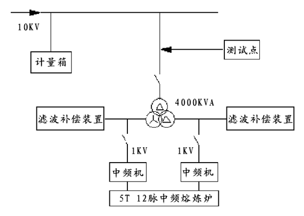 湖南某機(jī)械鑄造廠的主要負(fù)載為1臺12脈5噸中頻熔煉爐。電氣部分高壓采用交流10kV供電,變壓器容量為ZSSP-4MVA:1臺,10kV/1000V,額定電流 231A/1155A,變壓器短路阻抗7.52%。