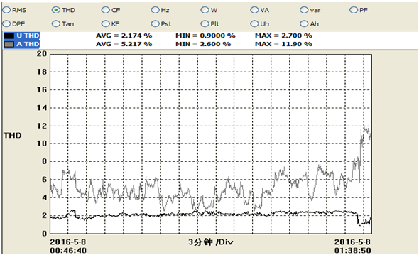 經(jīng)過認(rèn)真安裝調(diào)試,SVG裝置按用戶要求,2016年9月已投入正常運(yùn)行,現(xiàn)按功率因數(shù)自動補(bǔ)償運(yùn)行,功率因數(shù)設(shè)定值為97%,投運(yùn)后工作正常,用戶十分滿意。根據(jù)用戶要求,在安裝調(diào)試完畢后對機(jī)械鑄造廠高壓側(cè)進(jìn)行了諧波補(bǔ)償效果并進(jìn)行了測試。