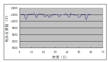 FGSVG運(yùn)行后無功功率補(bǔ)償效果非常理想,系統(tǒng)側(cè)平均功率因數(shù)穩(wěn)定在0.95以上,系統(tǒng)側(cè)的無功功率降低到300kvar以下。FGSVG投運(yùn)后對沖擊性無功功率快速補(bǔ)償,有效的抑制了電網(wǎng)電壓的閃變,電網(wǎng)電壓最大波動200V,基本穩(wěn)定在10500V附近,保證了用電設(shè)備的安全運(yùn)行,如圖4所示。