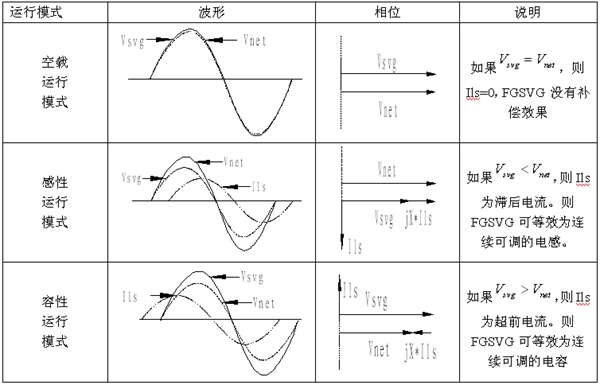 在交流電路中,電壓和電流的相位有三種情況,當(dāng)負載是純電阻特性時,電壓和電流相位相同;當(dāng)負載是(或含有)電感特性時,電壓相位超前電流相位;當(dāng)負載是(或含有)容性特性時,電壓相位滯后電流相位。如圖3所示,基本原理就是將自換相橋式電路通過變壓器或者電抗器并聯(lián)在電網(wǎng)上,適當(dāng)?shù)卣{(diào)節(jié)橋式電路交流側(cè)輸出電壓的幅值和相位,或者直接控制其交流側(cè)電流就可以使該電路吸收或者發(fā)出滿足要求的無功電流,實現(xiàn)動態(tài)無功補償?shù)哪康模绫?所示。