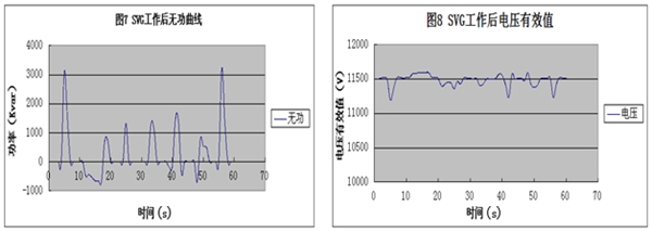 SVG運行后無功功率補償效果較好,軋鋼機運行最大功率時偶爾出現(xiàn)3000kvar左右無功功率,此時有功功率大約11000kW以上,總體功率因數(shù)計算下來也滿足要求。由于濾波器支路與部分FC支路容量超過SVG總額定容量,因此在廠內(nèi)負載較小時會出現(xiàn)過補現(xiàn)象,但是過補容量時間較少并且功率不超過-700kvar,因此總體上也滿足功率因數(shù)的要求。