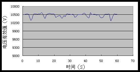 FGSVG運(yùn)行后無功功率補(bǔ)償效果非常理想,系統(tǒng)側(cè)平均功率因數(shù)穩(wěn)定在0.94以上,系統(tǒng)側(cè)的無功功率降低到500kvar以下,如圖4。FGSVG投運(yùn)后對(duì)沖擊性無功功率快速補(bǔ)償,有效的抑制了電網(wǎng)電壓的閃變,電網(wǎng)電壓最大波動(dòng)200V,基本穩(wěn)定在10500V附近,保證了用電設(shè)備的安全運(yùn)行,如圖5。