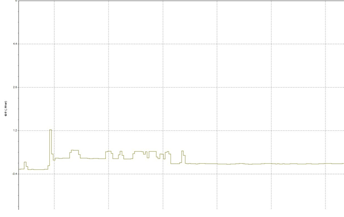 圖9是記錄的10kV1段直新線SVG投運前后系統(tǒng)的無功值,左半部分為SVG未投運時系統(tǒng)的無功值,可以看出系統(tǒng)無功值波動較大,且最大值到了1.25Mvar;右半部分是SVG投運后系統(tǒng)的無功值,可以看出無功值近乎為0,較小,且波動較小,由此可以看出SVG對補償系統(tǒng)無功效果顯著。