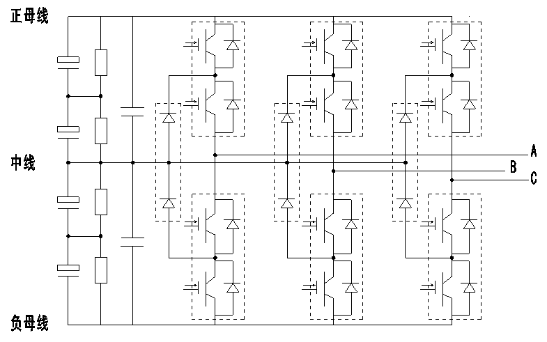 逆變單元的主要作用是把系統(tǒng)瞬間剎車積聚的能量逆變成與電網(wǎng)電壓同步的交流電回送至電網(wǎng)。目前地鐵牽引供電系統(tǒng)電壓一般有兩個電壓等級即直流750V和1500V,逆變主電路采用二極管箝位三電平電路拓?fù)?。主電路拓?fù)淙鐖D3所示。