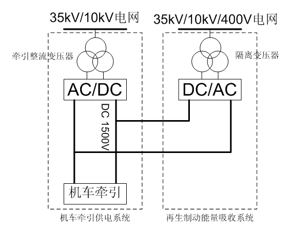 再生制動能量吸收裝置是并聯(lián)在1500V/750V直流系統(tǒng)中,經(jīng)過逆變裝置變成交流,經(jīng)隔離變壓器輸入到電網(wǎng)(35kV/10kV/400V)。