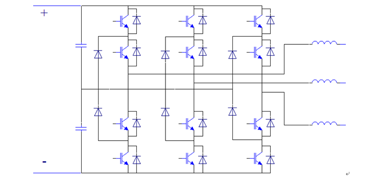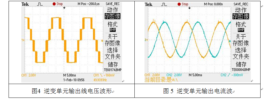 逆變裝置的單元采用三電平拓?fù)潆娐罚鐖D3所示。逆變輸出電壓波形、輸出電流波形分別如圖4、5所示。