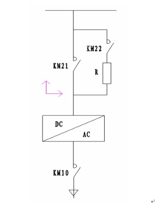 逆變裝置的一次主回路主要有直流接觸器、逆變單元、濾波電抗器、交流接觸器等部分組成。整機(jī)主回路圖如圖1所示。