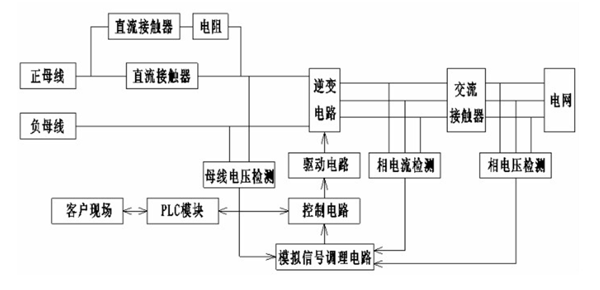 本設(shè)備在接收到總控裝置啟動(dòng)信號(hào),即啟動(dòng)/退出信號(hào)的無源常開結(jié)點(diǎn)閉合后,經(jīng)過控制回路動(dòng)作,送出啟動(dòng)完畢確認(rèn)信號(hào),即此無源常開結(jié)點(diǎn)閉合。總控裝置檢測到啟動(dòng)完畢確認(rèn)信號(hào)后,根據(jù)母線電壓幅值給出開機(jī)結(jié)點(diǎn)信號(hào)。結(jié)點(diǎn)閉合逆變裝置IGBT瞬間開通,進(jìn)行能量回饋。逆變?cè)O(shè)備工作過程中,時(shí)刻接受總控裝置的控制信號(hào)并及時(shí)回復(fù)設(shè)備內(nèi)接觸器、各個(gè)單元的工作狀態(tài)信號(hào)。圖6為整機(jī)的控制原理圖。